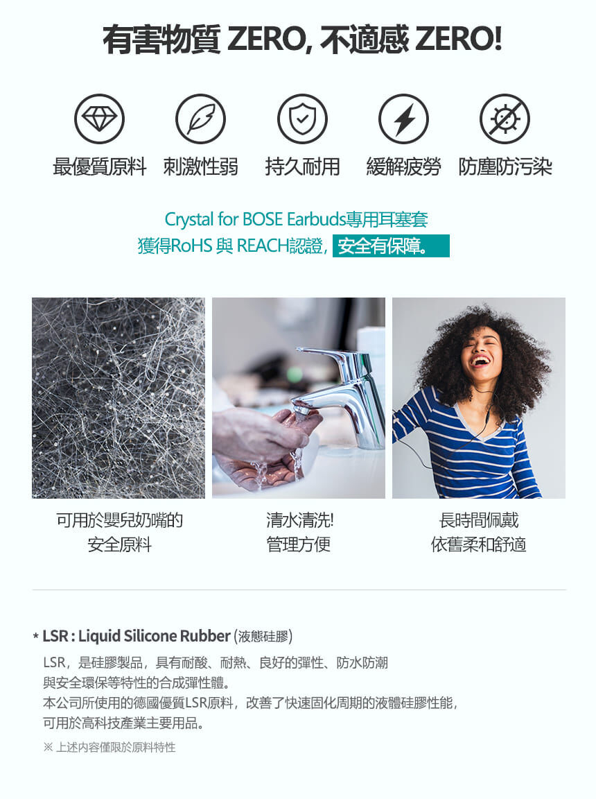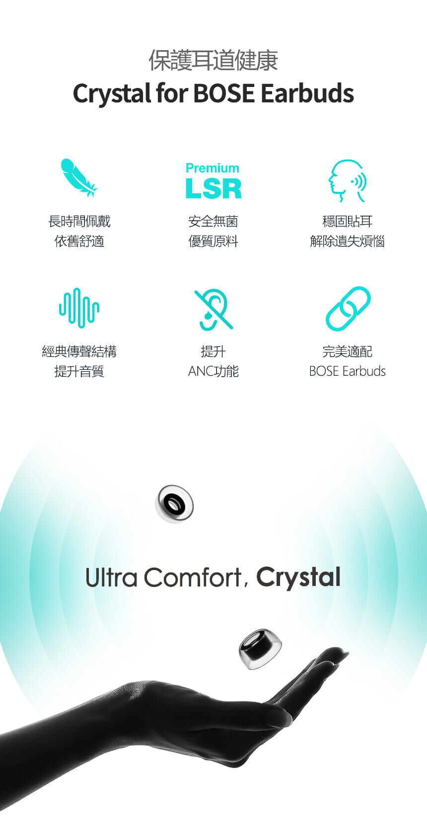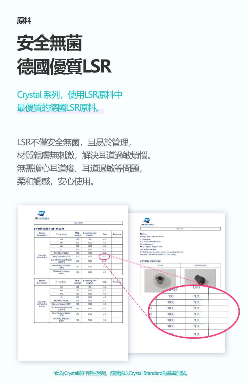 使用有效抑菌,管理方便且刺激性弱的原料,解決耳道疼癢與過敏問題,質地柔軟,舒適衛生,可放心佩戴。Crystal所用LSR原料,安全無菌,有效保護耳道皮膚。
