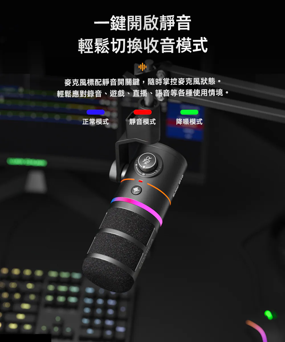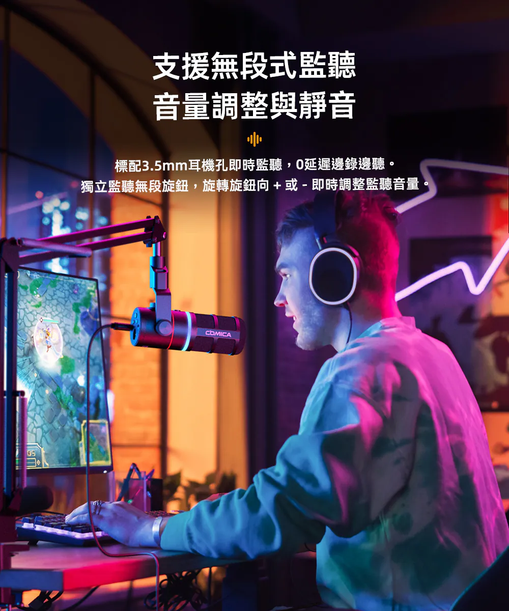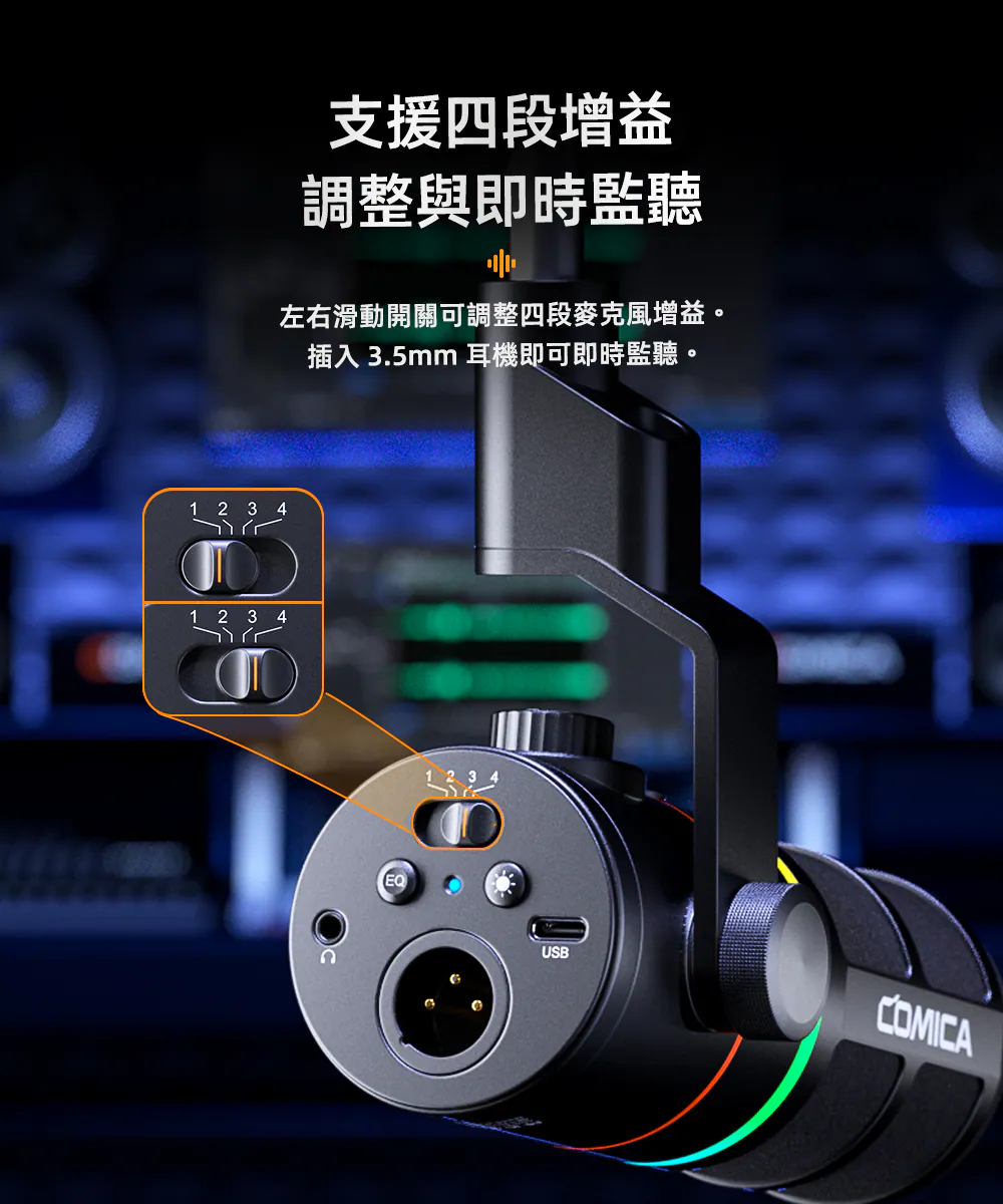 ● 支援增益調整、監聽、一鍵降噪與靜音