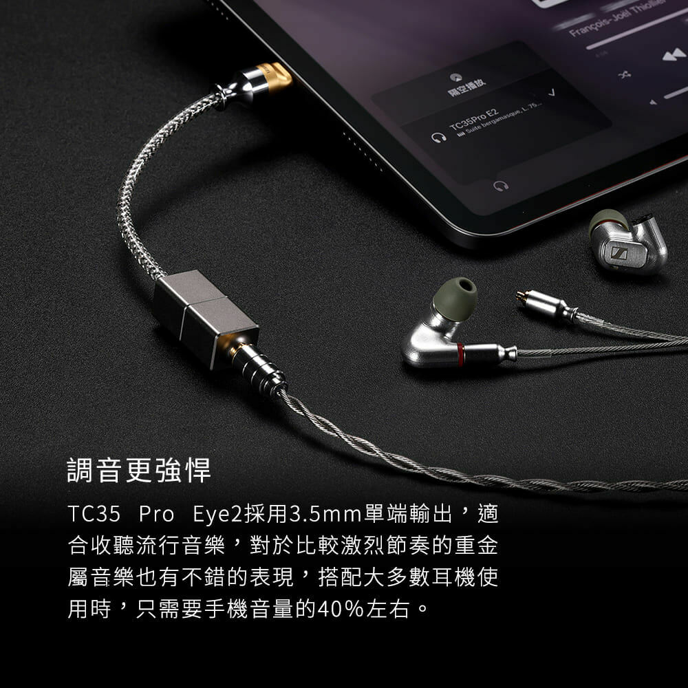 TC35 Pro Eye2採用3.5mm單端輸出,適合收聽流行音樂,對於比較激烈節奏的重金屬音樂也有不錯的表現,