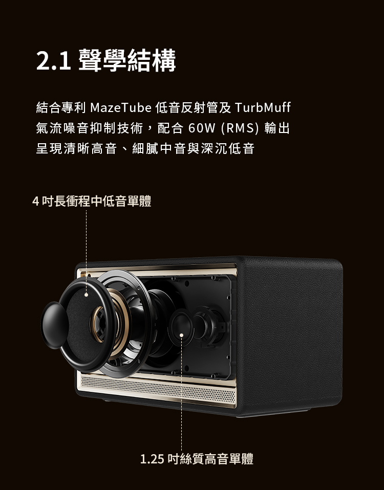 ● 搭載專利 MazeTube 低音反射孔+TurbMuff 氣流噪音抑制技術