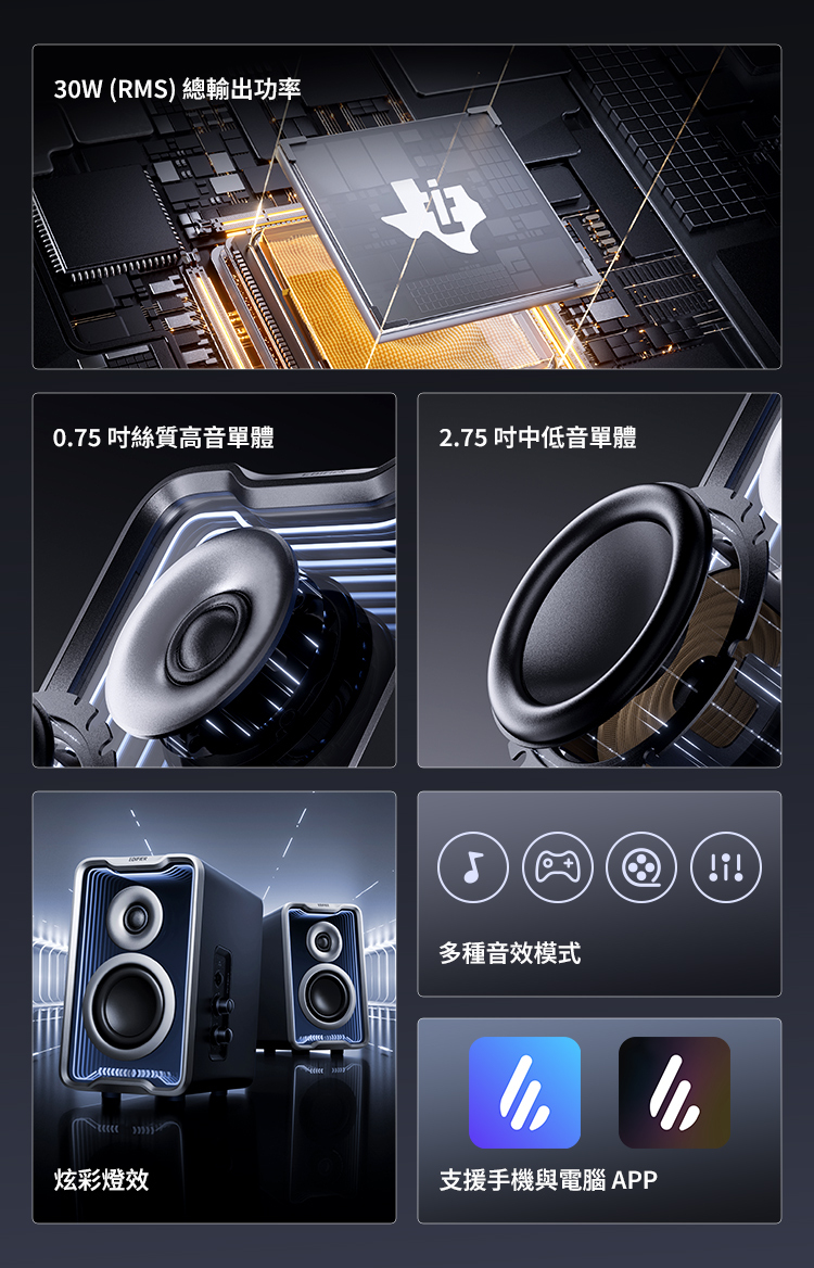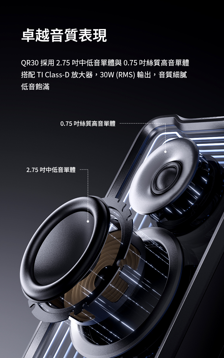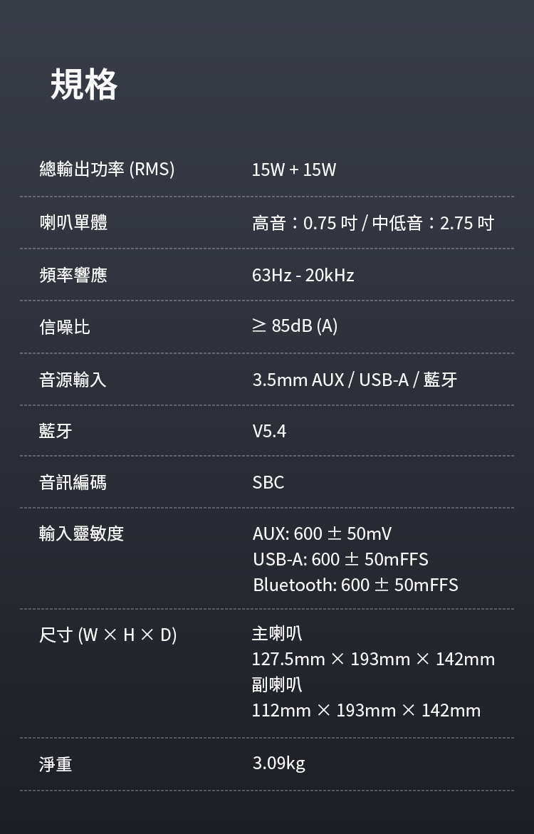 ● 2.0聲道立體聲場|15+15W RMS 功率