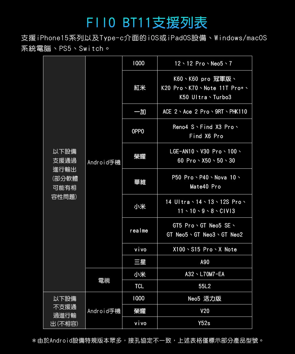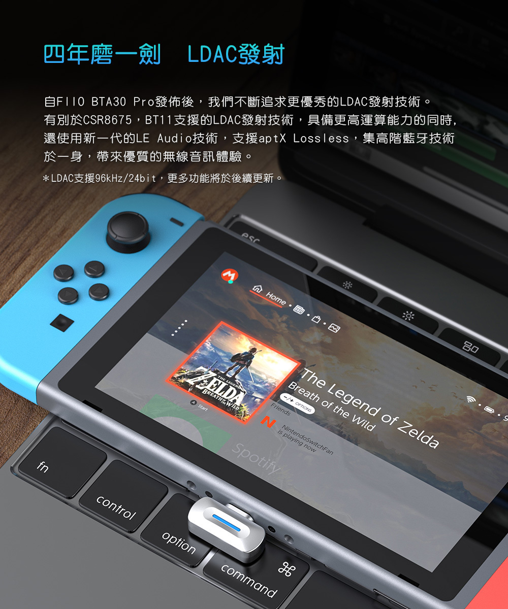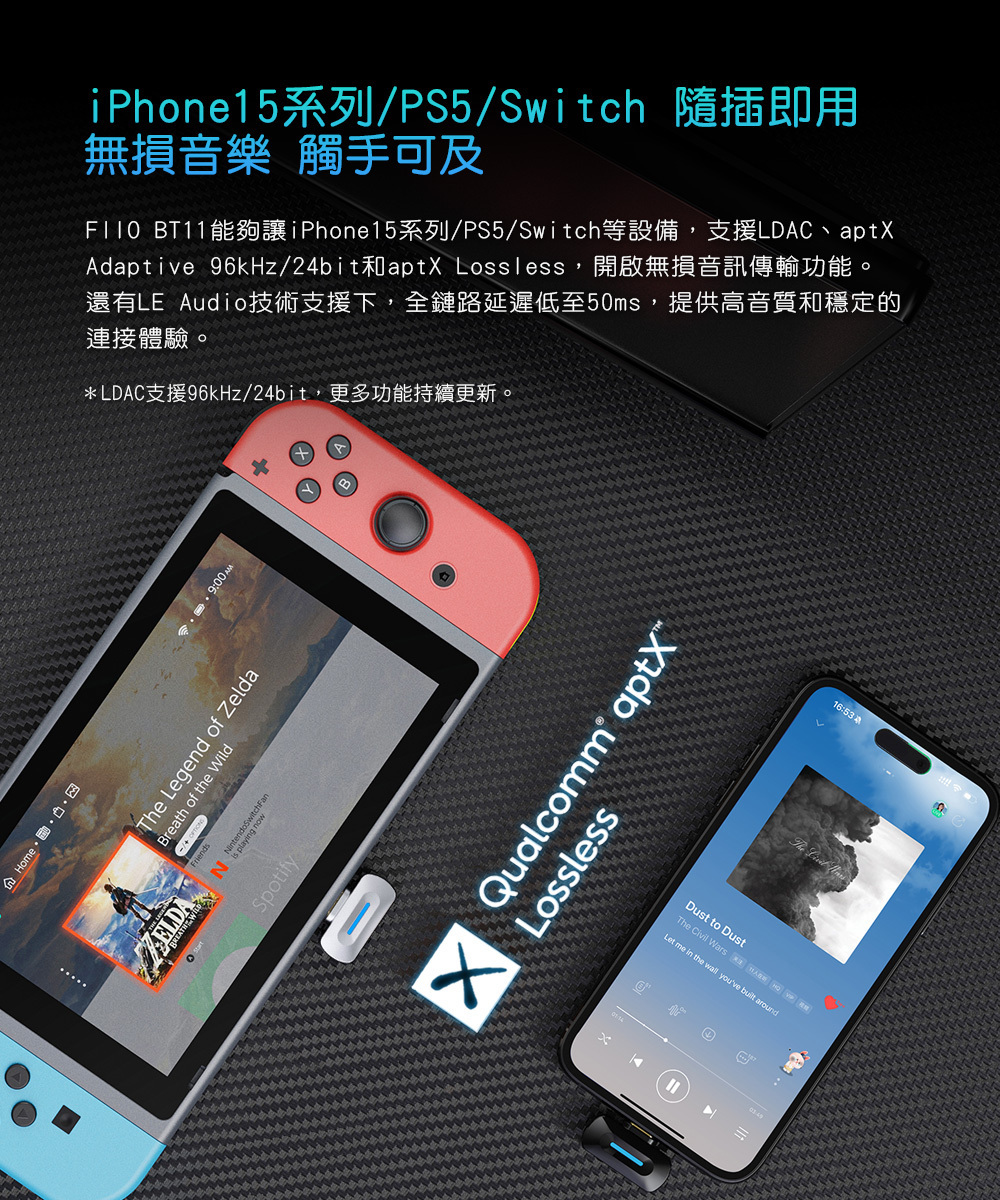 iPhone15系列/PS5/Switch隨插即用|FIIO BT11能夠讓iPhone15系列/PS5/Switch等設備,支援LDAC、aptX Adaptive 96kHz/24bit和aptX Lossless,開啟無損音訊傳輸功能。還有LE Audio技術支援下,全鏈路延遲低至50ms,提供高音質和穩定的連接體驗。