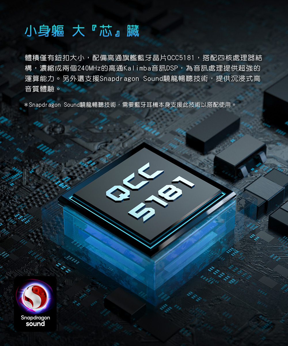 小身軀 大『芯』臟|體積僅有鈕扣大小,配備高通旗艦藍牙晶片QCC5181,搭配四核處理器結構,濃縮成兩個240MHz的高通Kalimba音訊DSP,為音訊處理提供超強的運算能力。另外還支援Snapdragon Sound驍龍暢聽技術,提供沉浸式高音質體驗。