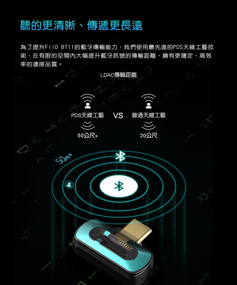 聽的更清晰、傳遞更長遠|為了提升FIIO BT11的藍牙傳輸能力,我們使用最先進的PDS天線工藝技術,在有限的空間內大幅提升藍牙訊號的傳輸距離,擁有更穩定、高效率的連接品質。