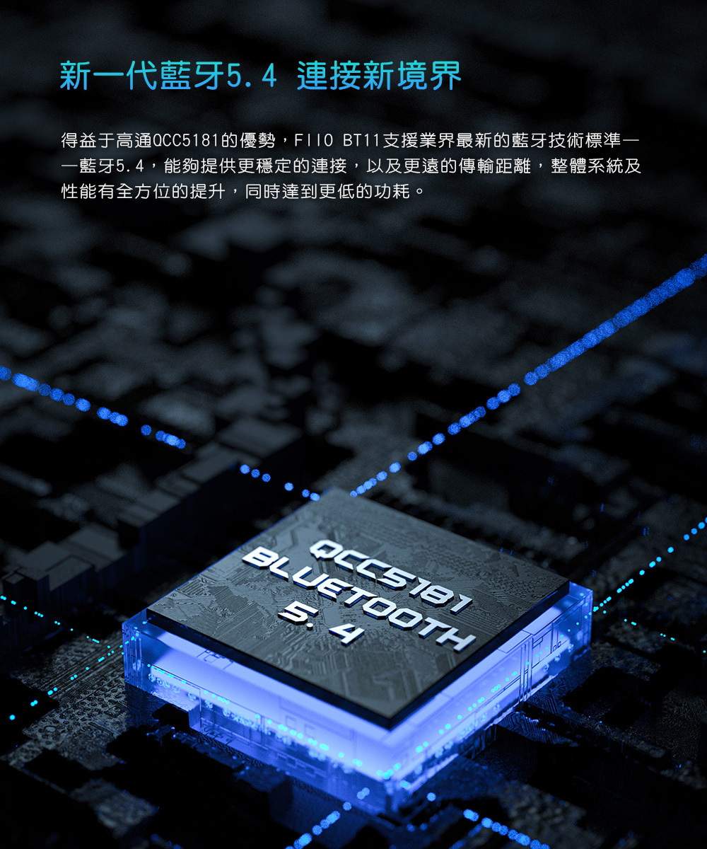 新一代藍牙5.4 連接新境界|得益于高通QCC5181的優勢,FIIO BT11支援業界最新的藍牙技術標準---藍牙5.4,能夠提供更穩定的連接,以及更遠的傳輸距離,整體系統及性能有全方位的提升,同時達到更低的功耗。