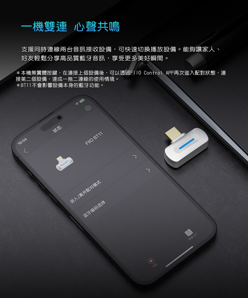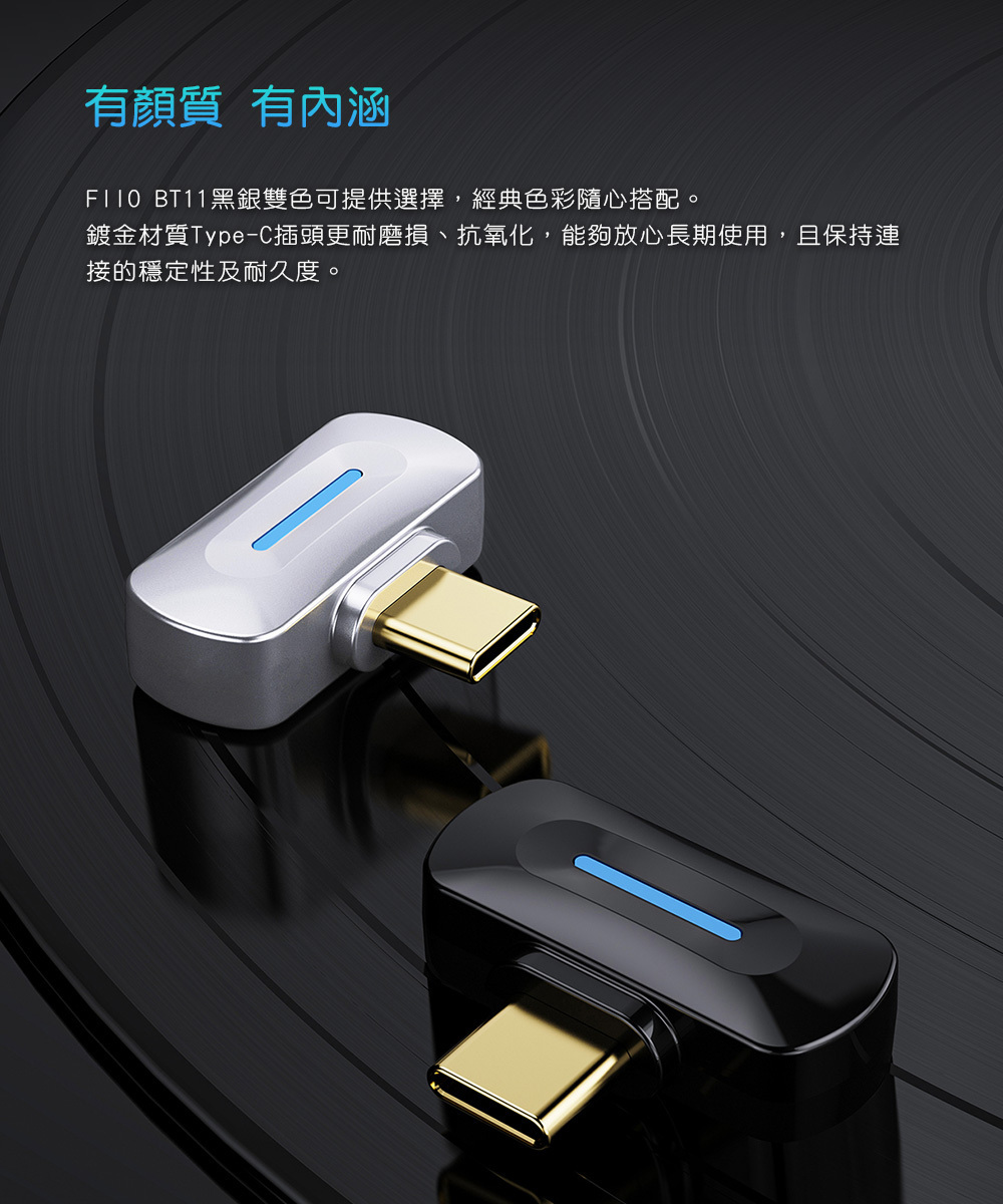 有顏質 有內涵|FIIO BT11黑銀雙色可提供選擇,經典色彩隨心搭配。鍍金材質Type-C插頭更耐磨損、抗氧化,能夠放心長期使用,且保持連接的穩定性及耐久度。