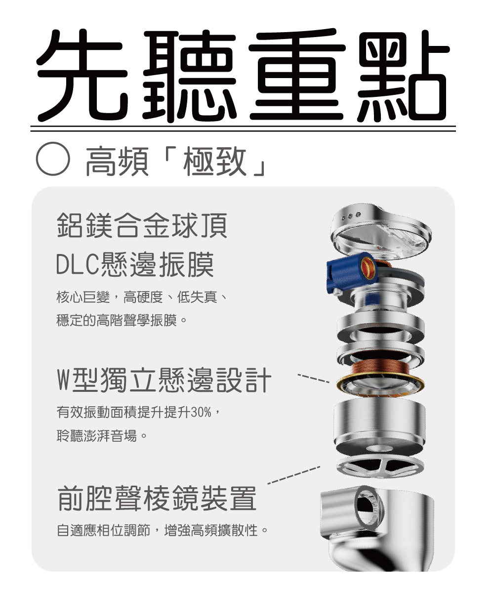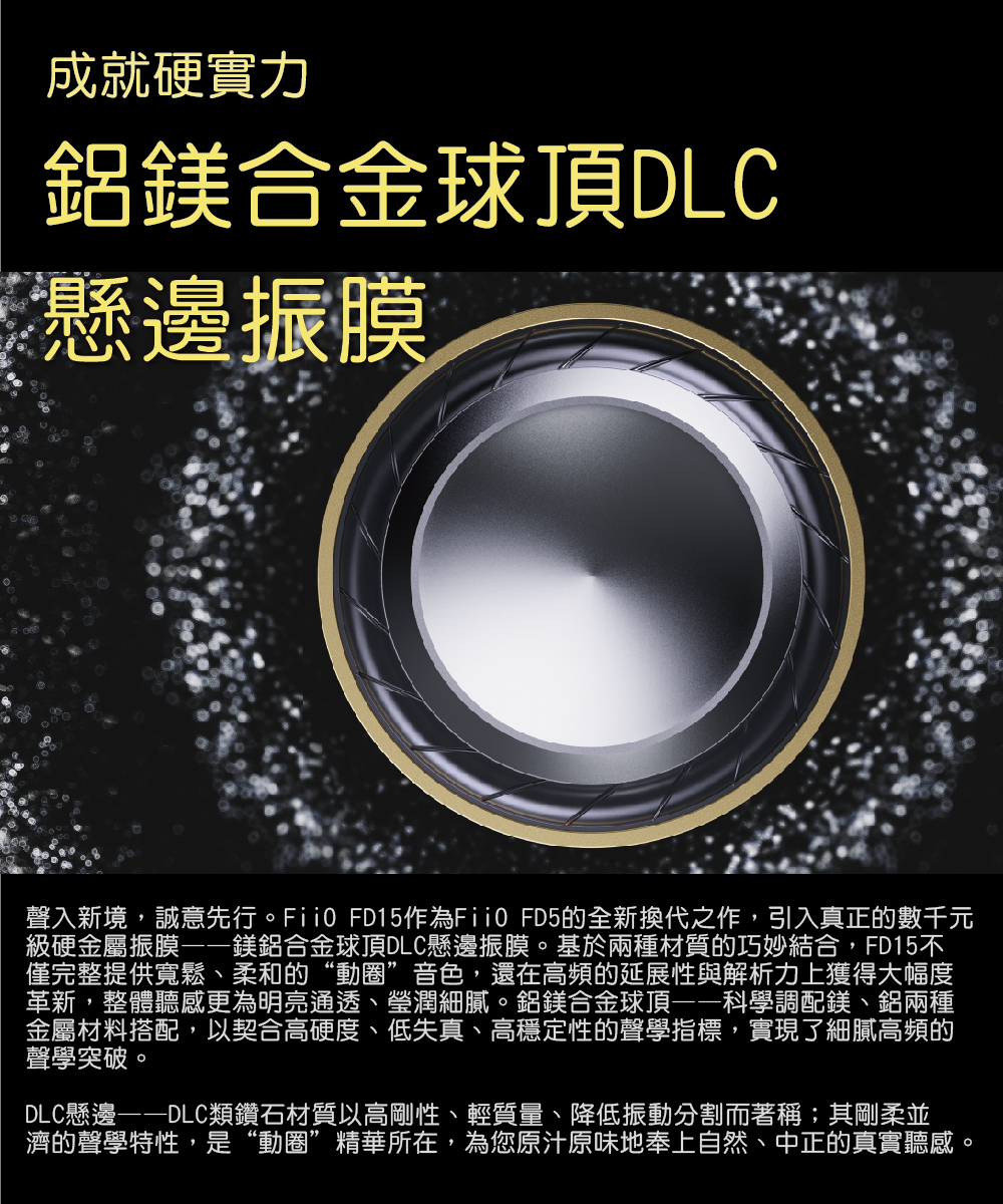 鋁鎂合金球頂DLC懸邊振膜 | 以高硬度、低失真、高穩定性的聲學指標,達到細膩高頻的聲學突破。