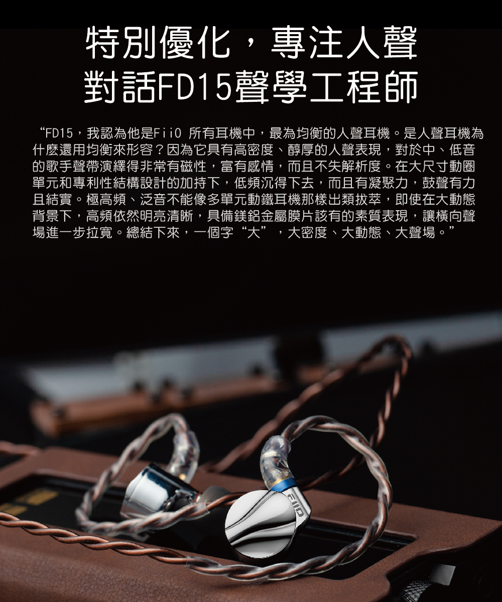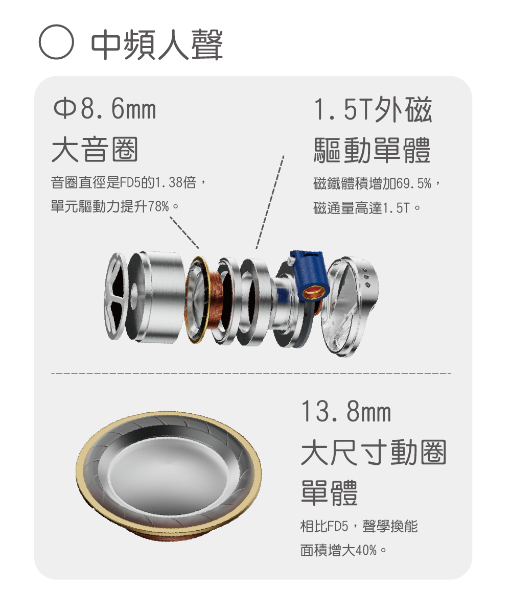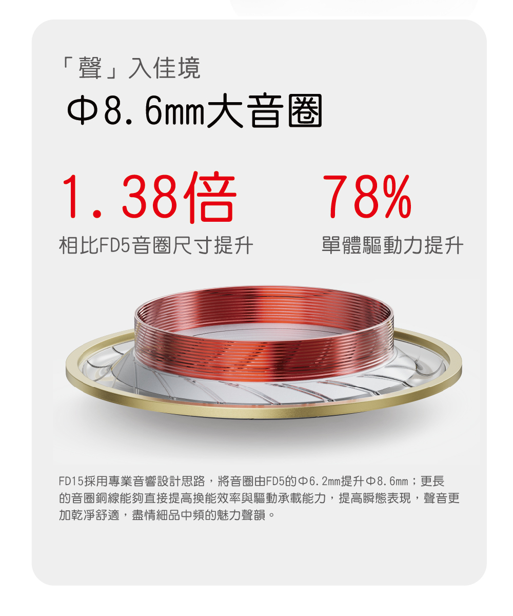 θ8.6mm大音圈 | FD15採用專業音響設計思維,音圈由FD5的θ6.2mm提升至θ8.6mm,提高整體瞬態表現,聲音更加乾淨舒適。