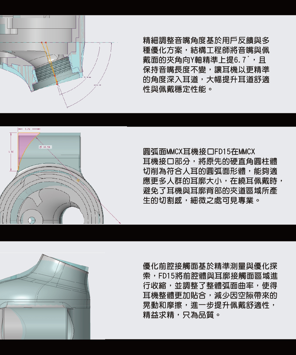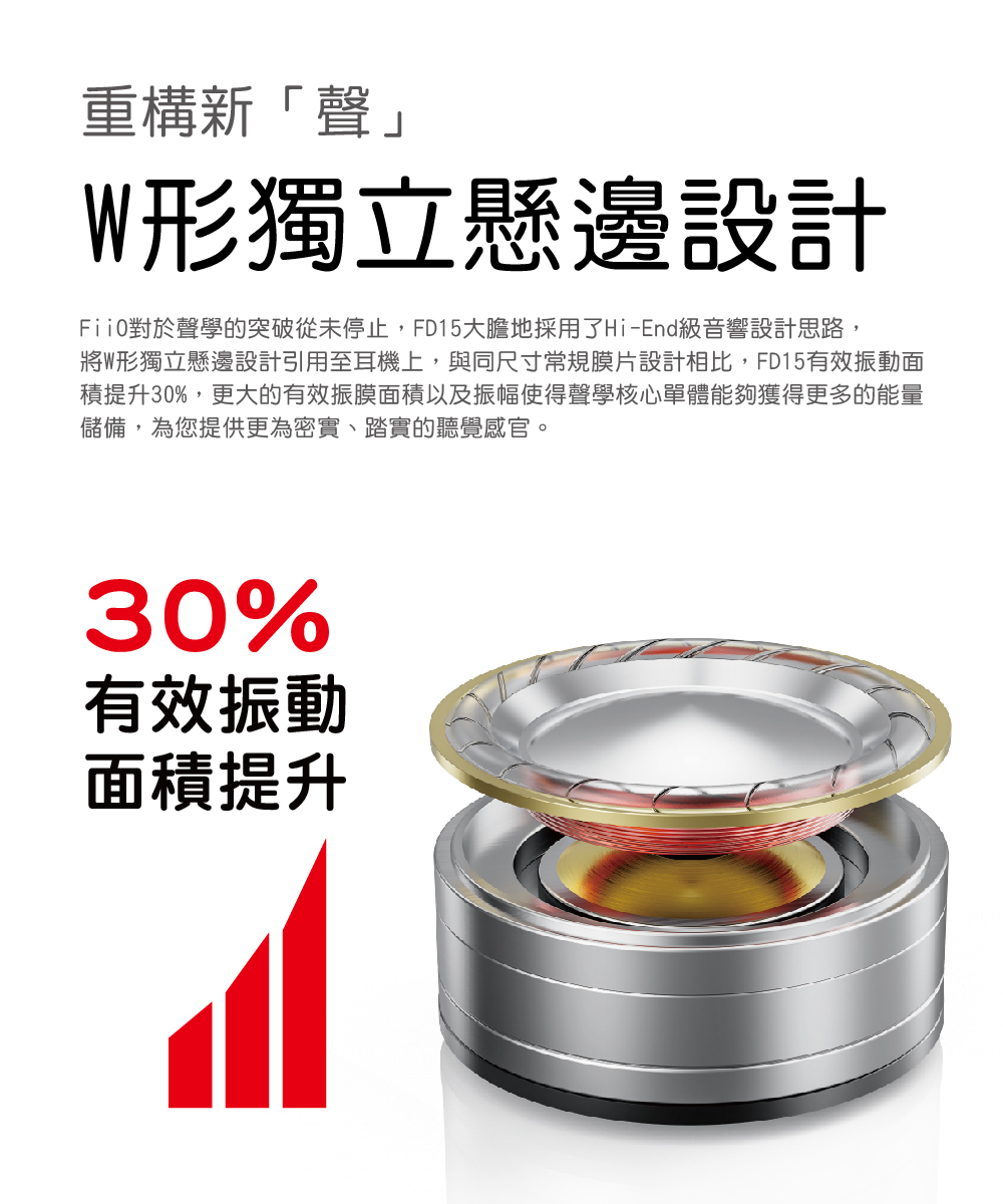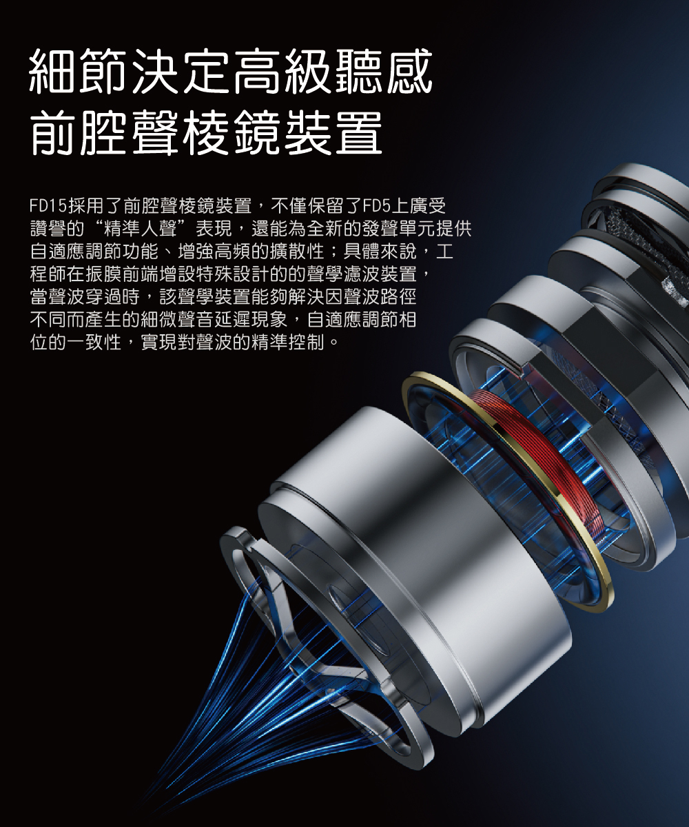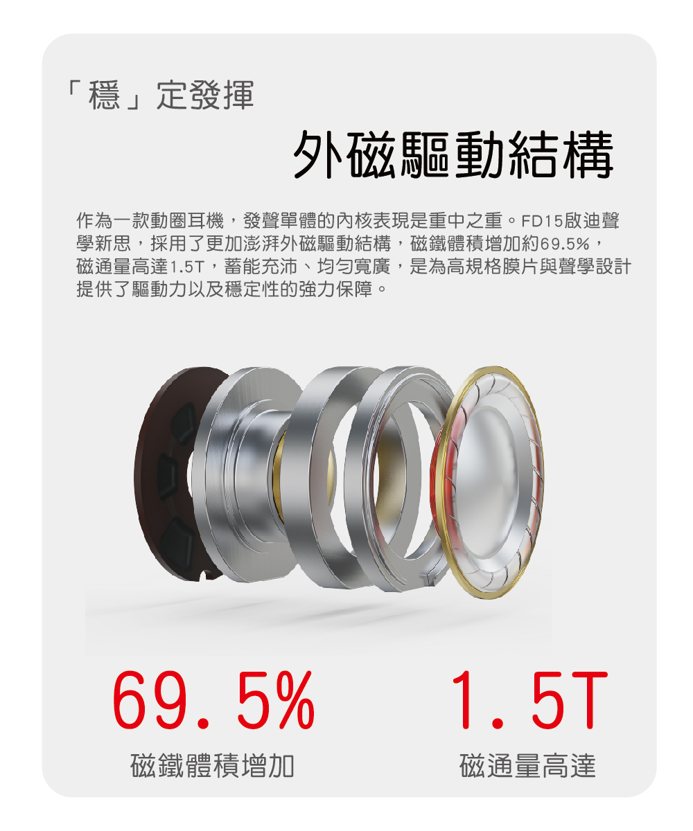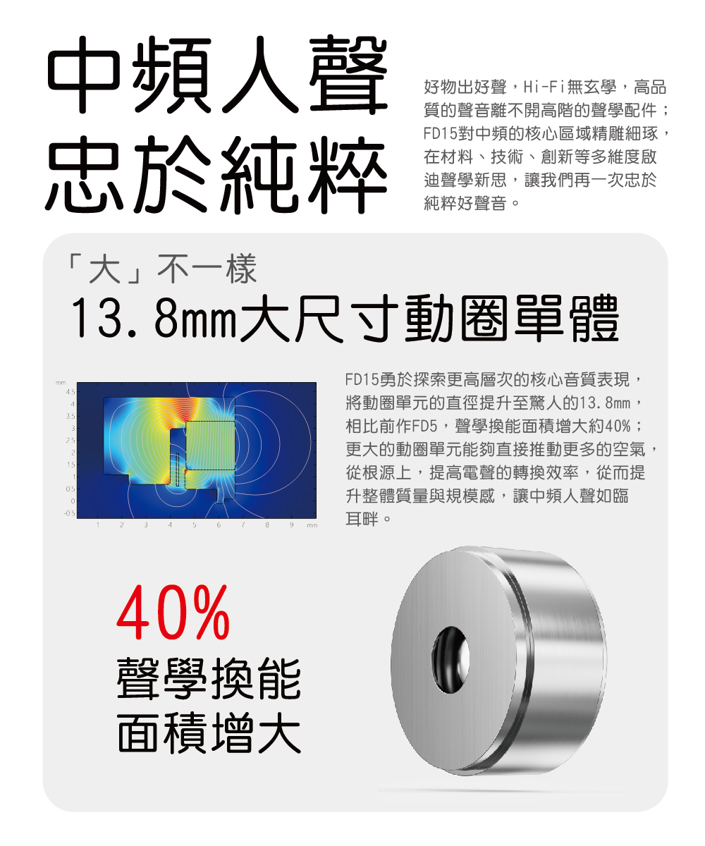 13.8mm大尺寸動圈單元 | FD15將動圈單元的直徑提升至驚人的13.8mm,聲學轉換能量提升40%。