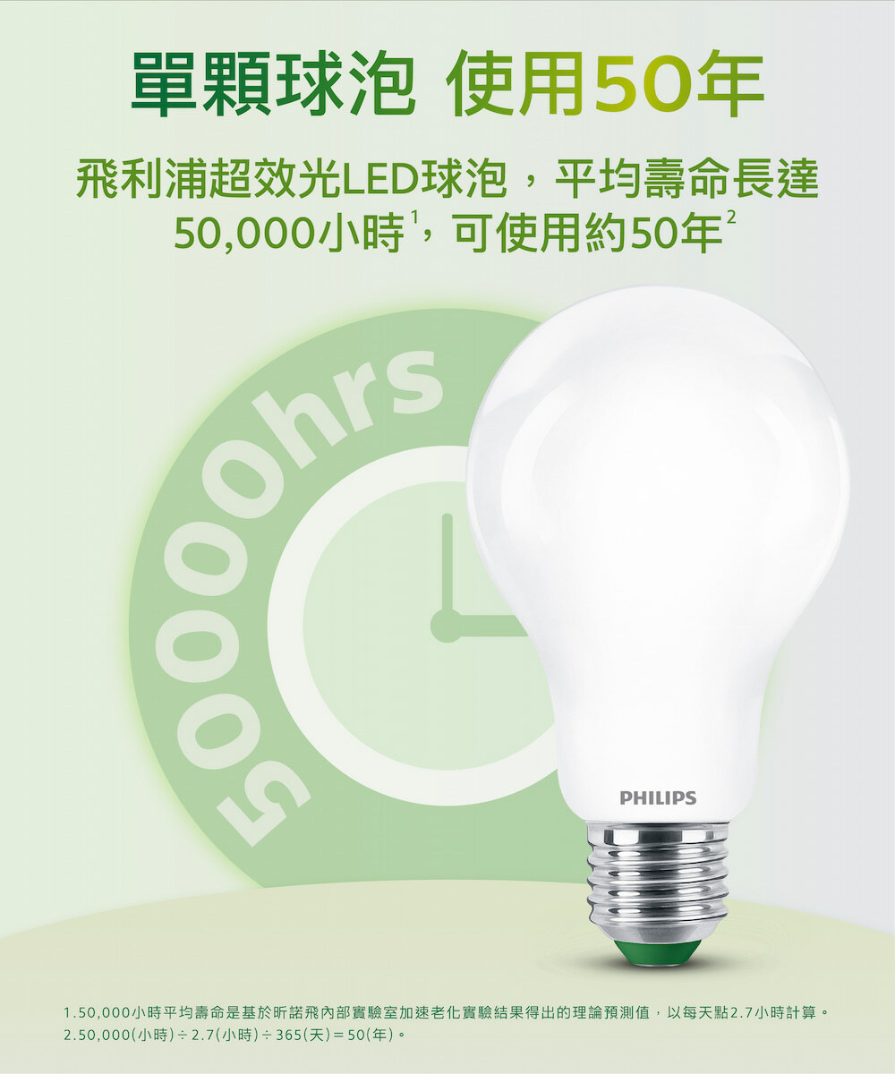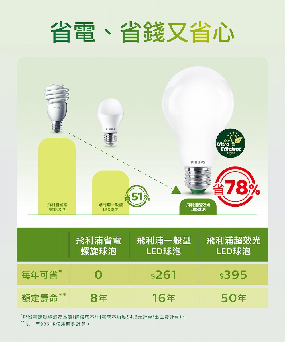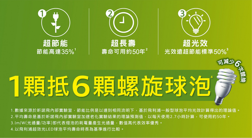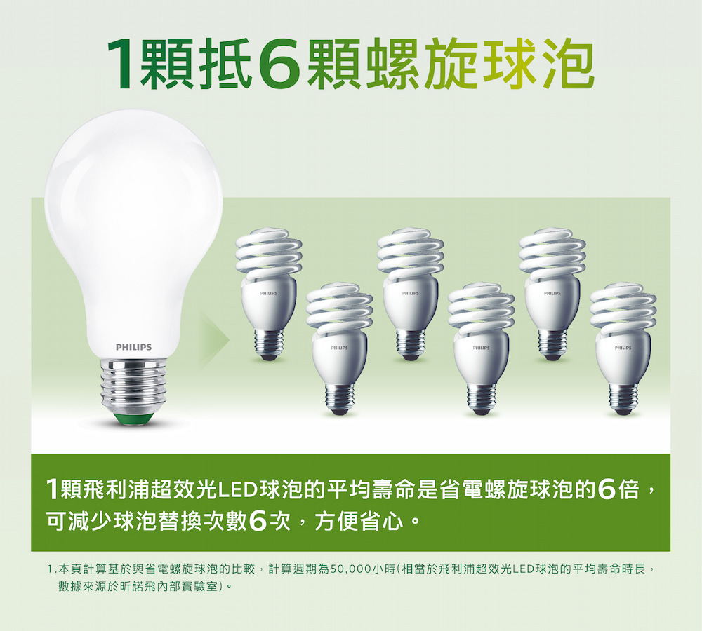 ● 1顆超光效燈泡的壽命=6顆省電螺旋燈泡的壽命