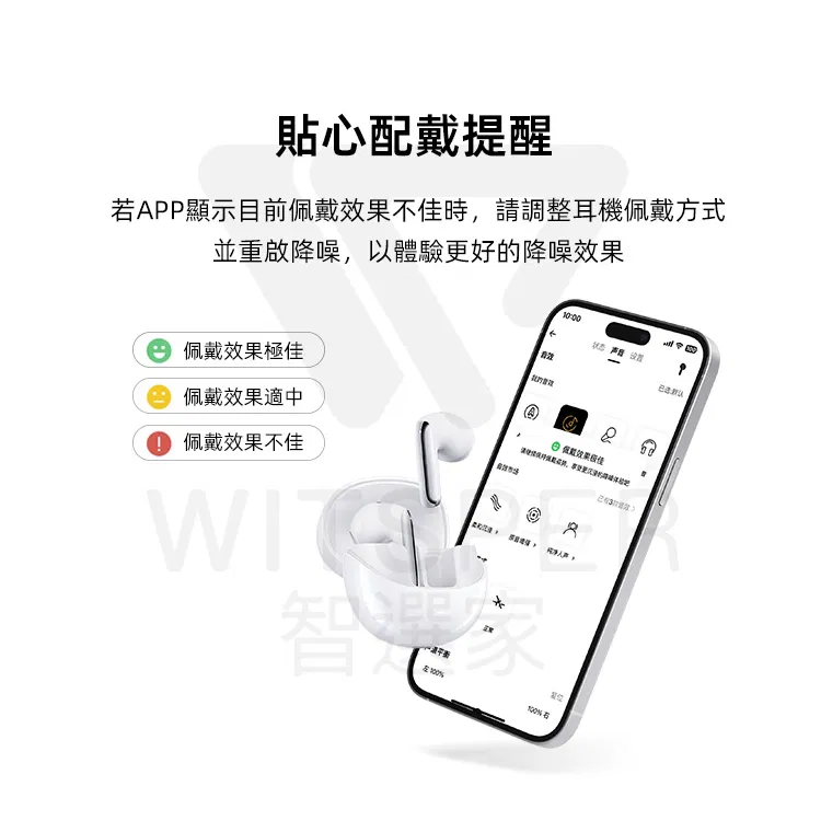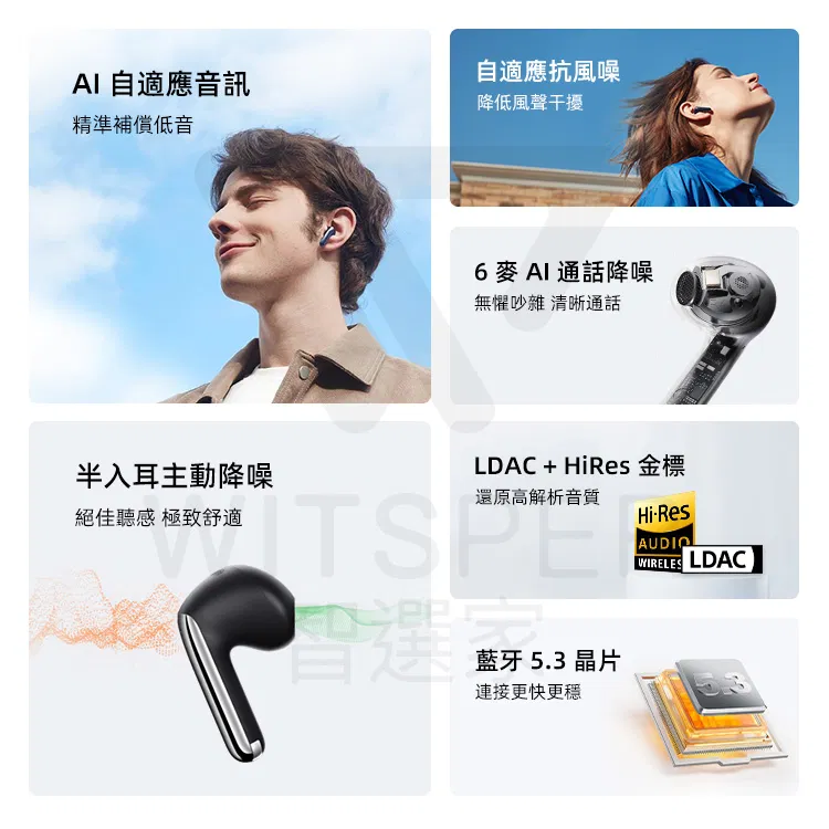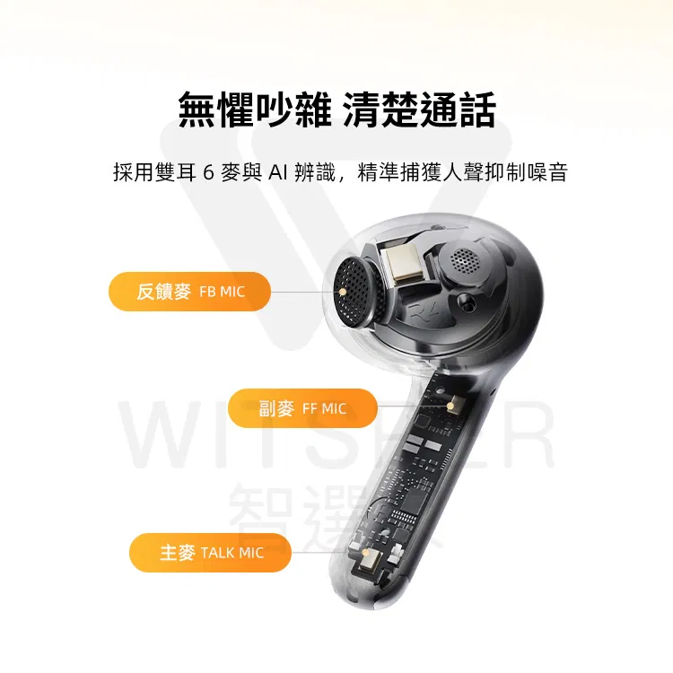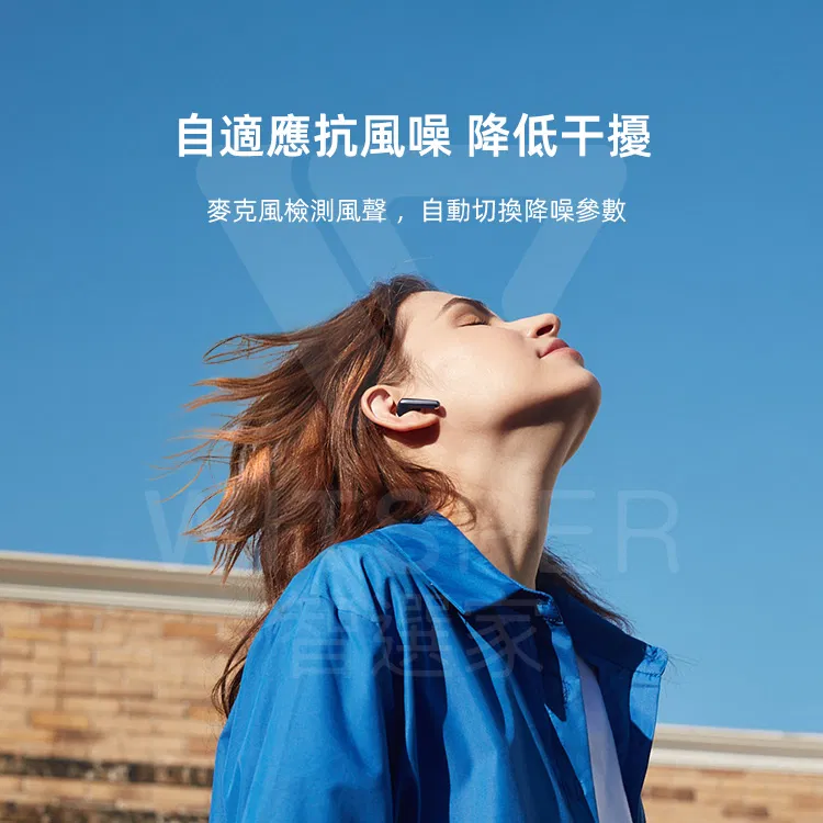 ● 通話降噪採用雙耳 6 麥與 AI 技術,無懼吵雜;自動檢測風聲、即時調整