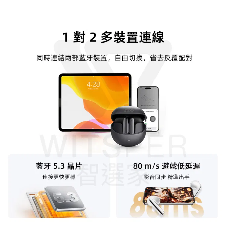 ● 藍牙 5.3 晶片,連線更快更穩;80 ms 低延遲遊戲模式,影音即時同步