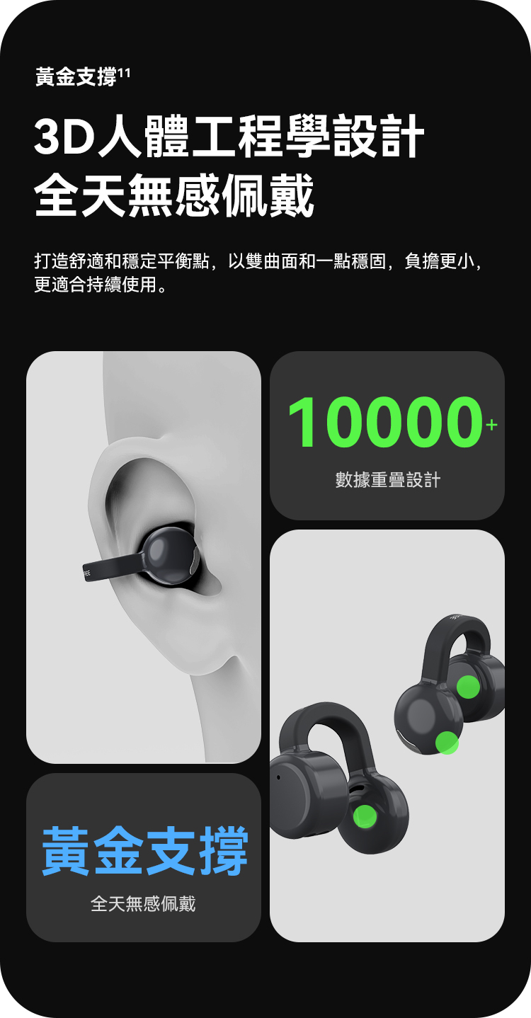 ● 3D人體工學設計,全天無感佩戴、穩固舒適