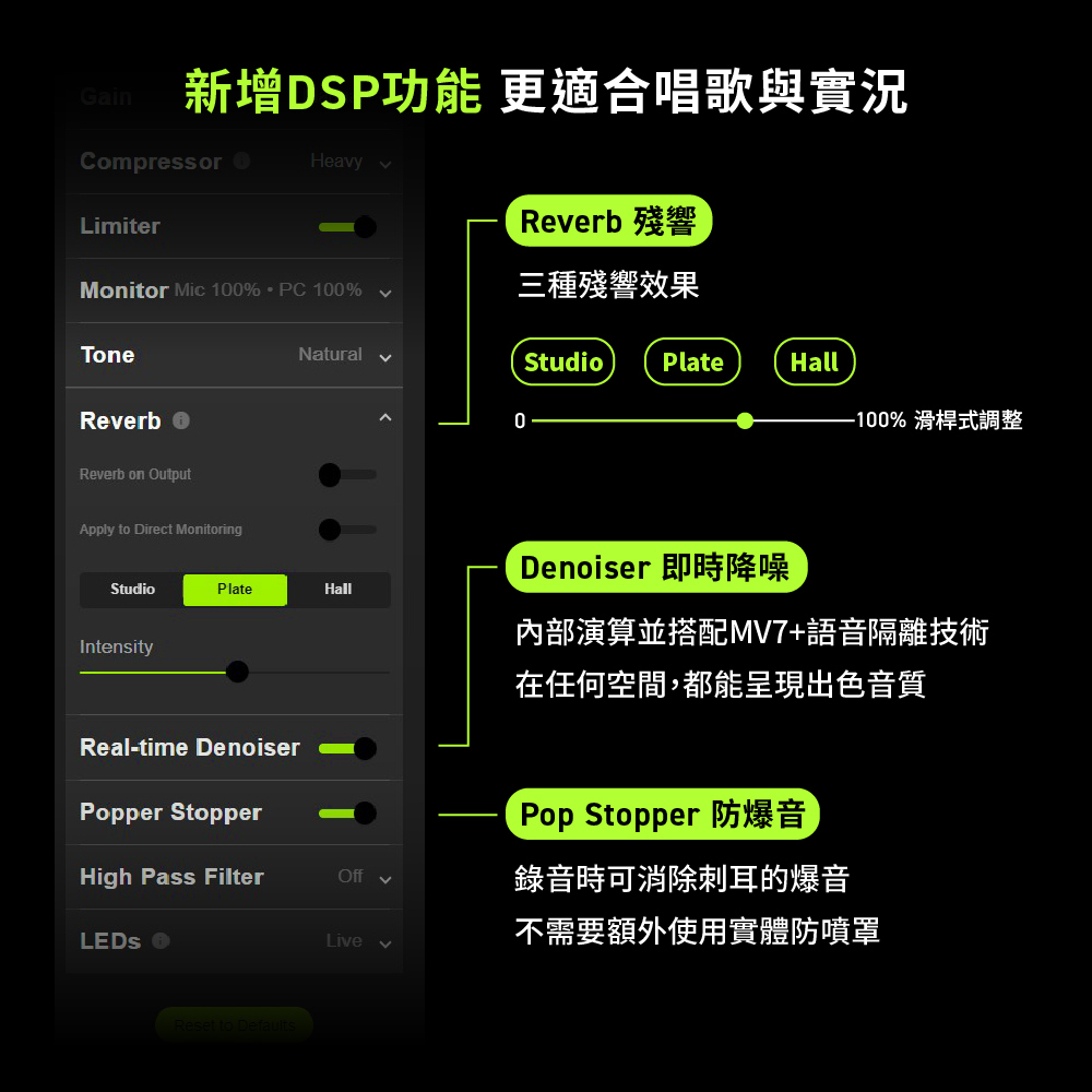● 新增DSP:Reverb(三段式效果),denoiser
