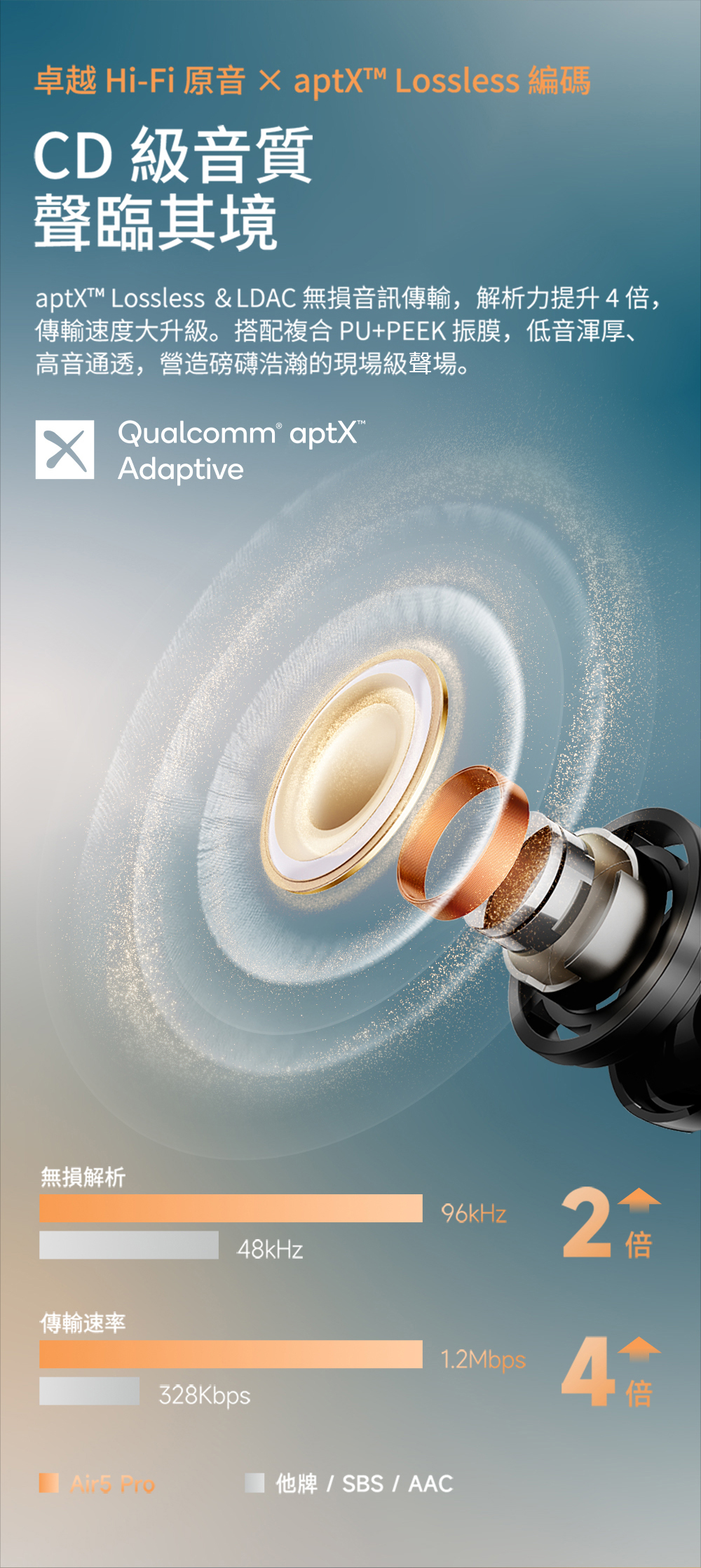 ● aptX™ Lossless 與 LDAC™ 雙金標認證,媲美 CD 級音質