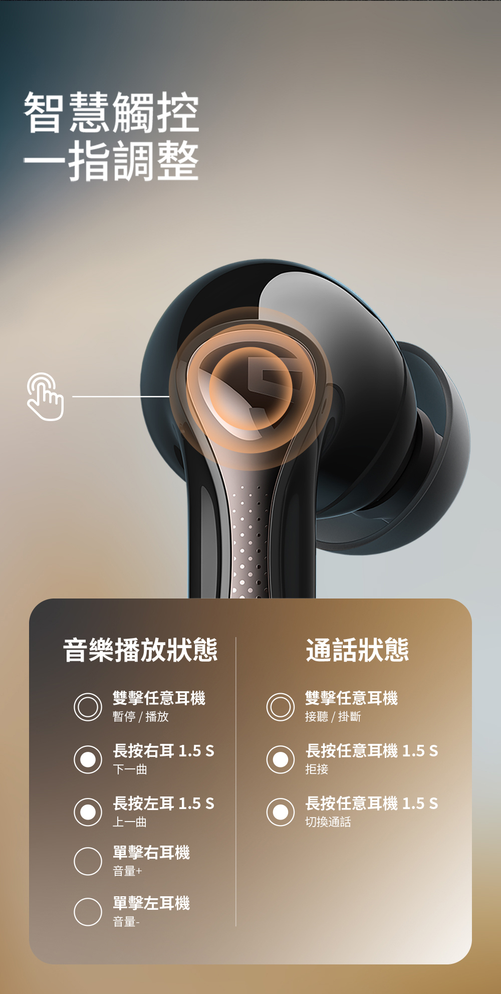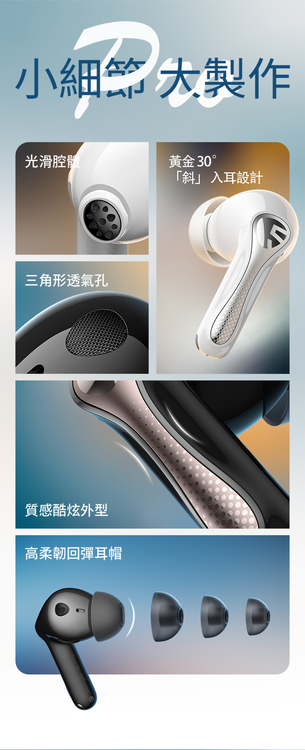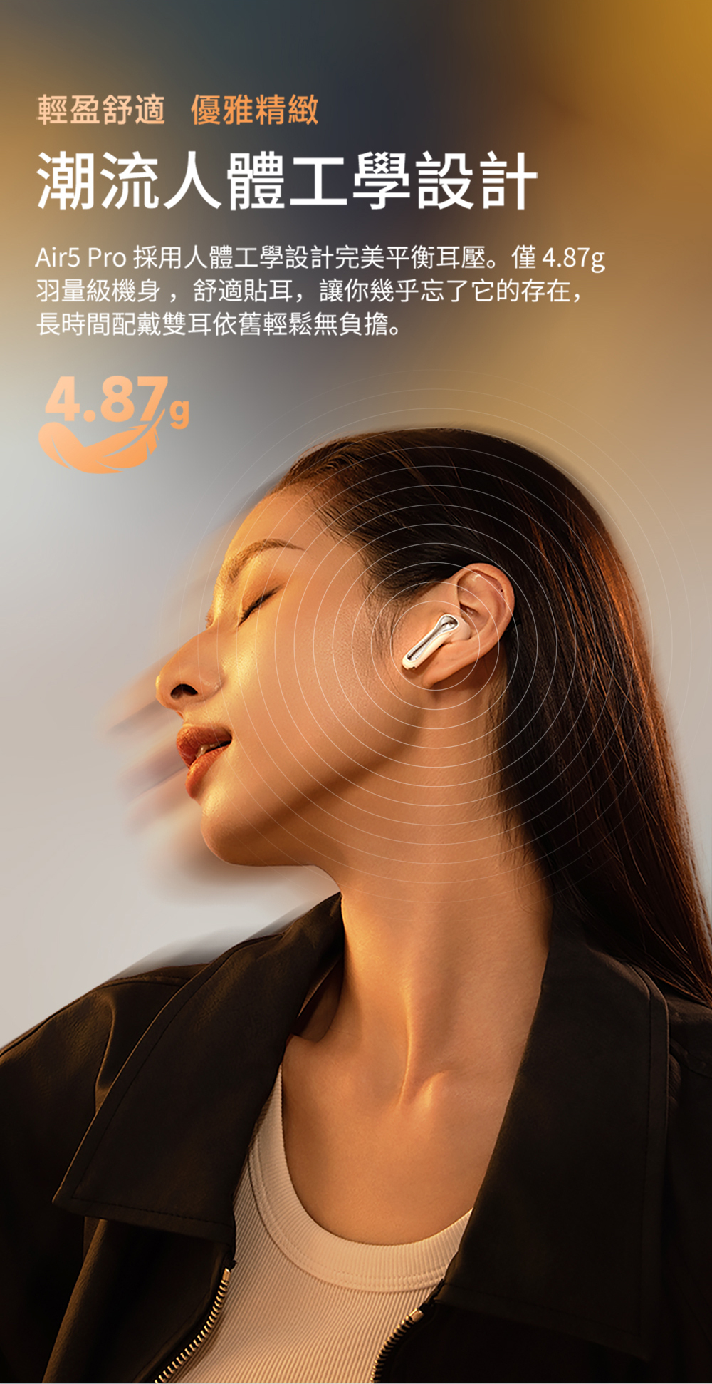 ● 輕盈設計,單耳僅 4.87g,長時間配戴無壓力