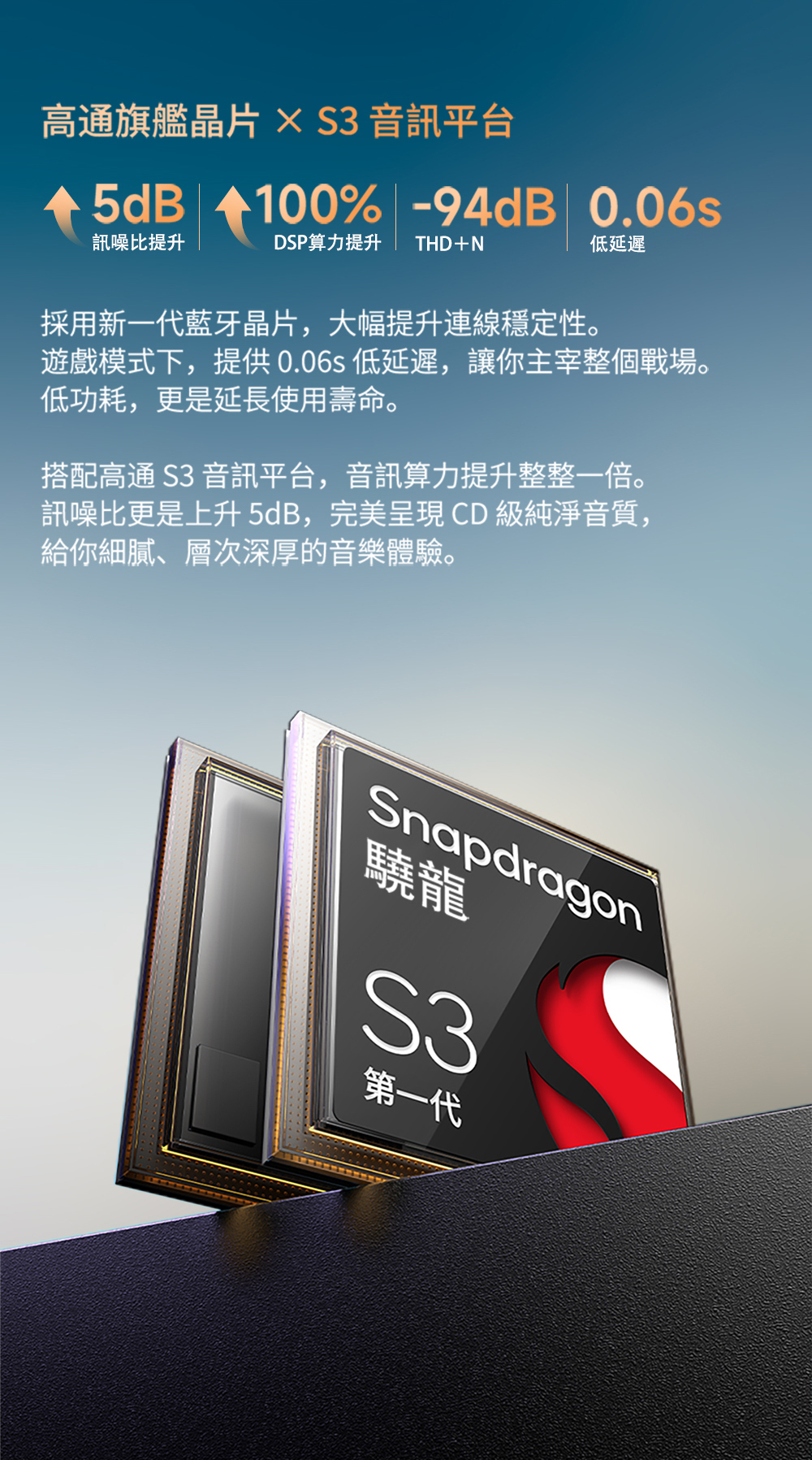 ● 高通 QCC3091 + S3 音訊平台,效能翻倍,連線穩定低延遲