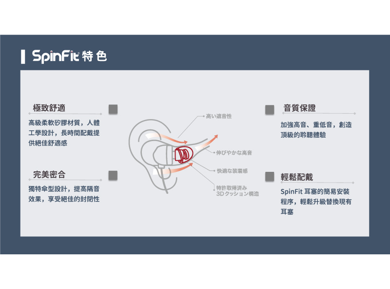 ● 特殊專利設計,輕鬆與耳道彎曲處貼合,同時導正聲音擴散的方向,減少高頻損失