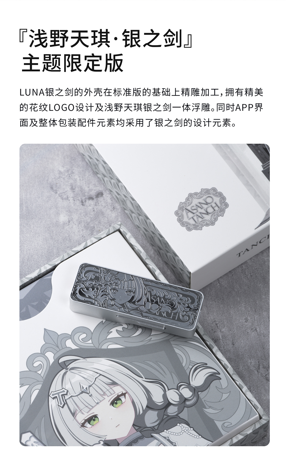 🔹LUNA延續了TANCHJIM備受好評的一體成型設計,外殼由整塊航空級鋁合金CNC加工而成,搭配鏡面LOGO設計,線條優美,簡約時尚。『淺野天琪・銀之劍』限定版更採用精美浮雕及專屬包裝,彰顯獨特品味。