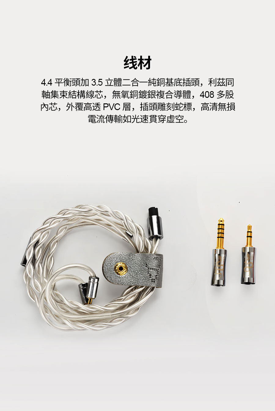 ● 高階鍍銀線材,支援4.4平衡與3.5立體聲二合一插頭,傳輸損耗低、相容多設備。