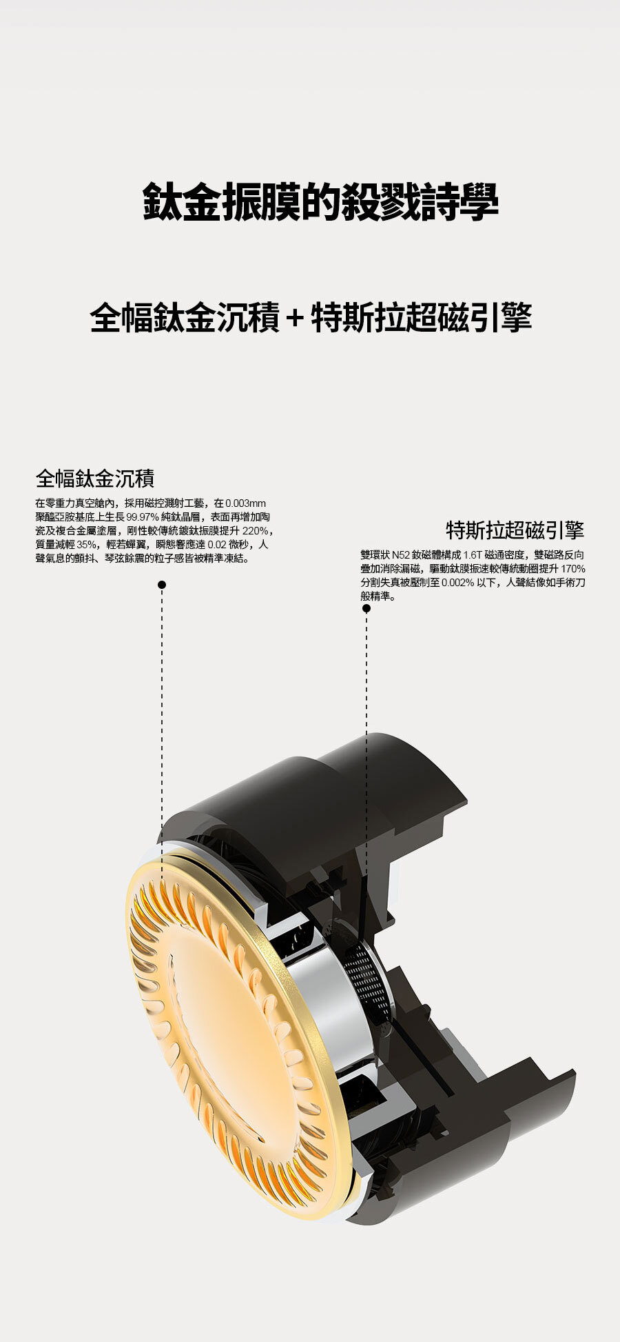 ● 採用全幅鈦金振膜,瞬態極快、泛音細節豐富,能真實呈現人聲氣息、樂器顫音。